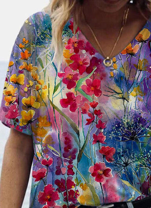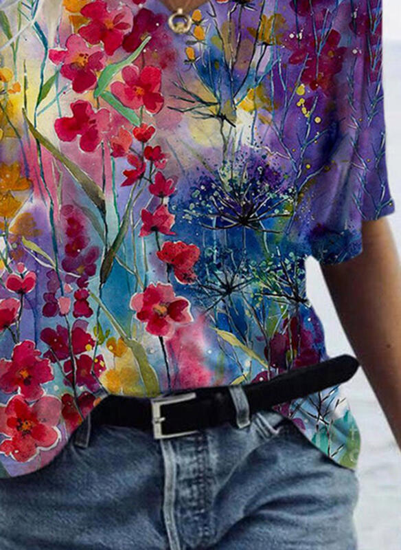 Bluzka krótki rękaw dekolt v wzór kwiaty ombre luźna na co dzień kobieca Marguerite