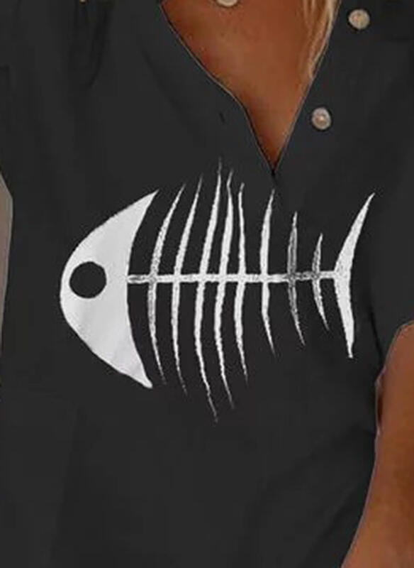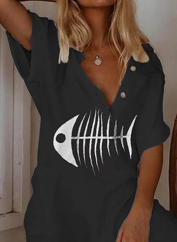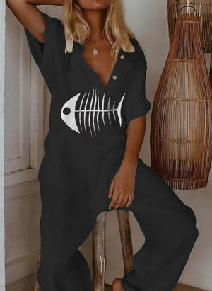 Kombinezon długa nogawka szeroka krótki rękaw dekolt v guziki grafika wzór luźny lato Guinevere