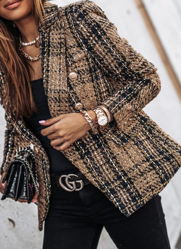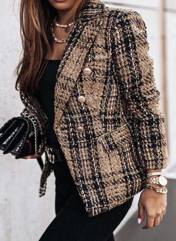 Ta kurtka to klasyczny sznyt w nowoczesnym wydaniu. Dwurzędowy model z guzikami nadaje jej eleganckiego stylu, podczas gdy tkanina tweedowa w kratę przypomina o szkockich korzeniach mody. Kurtka łączy w sobie tradycyjny kroj z nutką nonszalancji, dzięki czemu możesz ją nosić zarówno do pracy, jak i na wieczorne wyjście. Szare i brązowe odcienie tweedu sprawiają, że kurtka pasuje do większości ubrań w szafie, od spodni po sukienki. Zaokrąglony krój ramion i podkreślona talia podkreślają kobiece kształty. Od teraz tweedowa elegancja może towarzyszyć Ci przez cały rok.