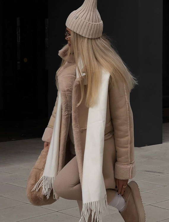 Prosty plaszcz podszyty kozuchem to klasyczna propozycja na zimowe miesiace. Zapewnia skuteczna ochrone przed chlodem, a delikatne wykonczenie od wewnatrz gwarantuje dodatkowe cieplo i wygode. Jego minimalistyczny krój sprawia, ze swietnie komponuje sie z róznymi stylizacjami. To uniwersalny element garderoby, który pasuje na kazda okazje.