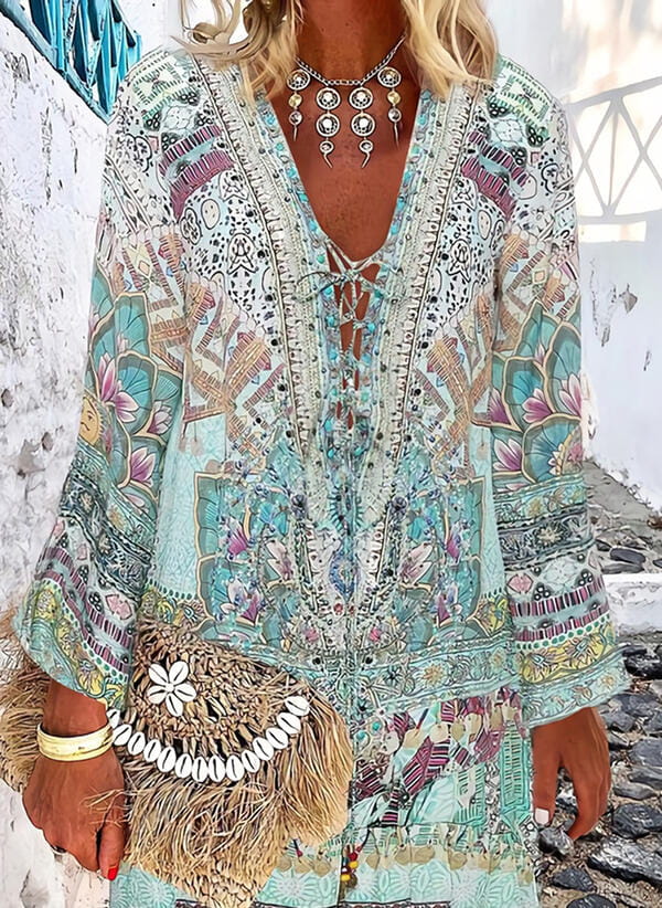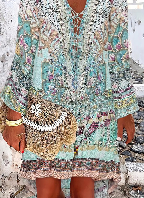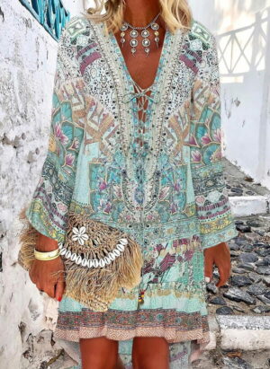 Sukienka długi rękaw dekolt wiązanie etniczny wzór aztecki boho na plażę na lato kobieca baby doll luźna Amanta