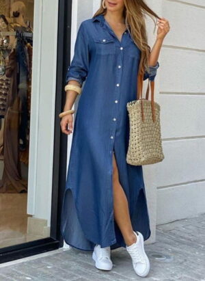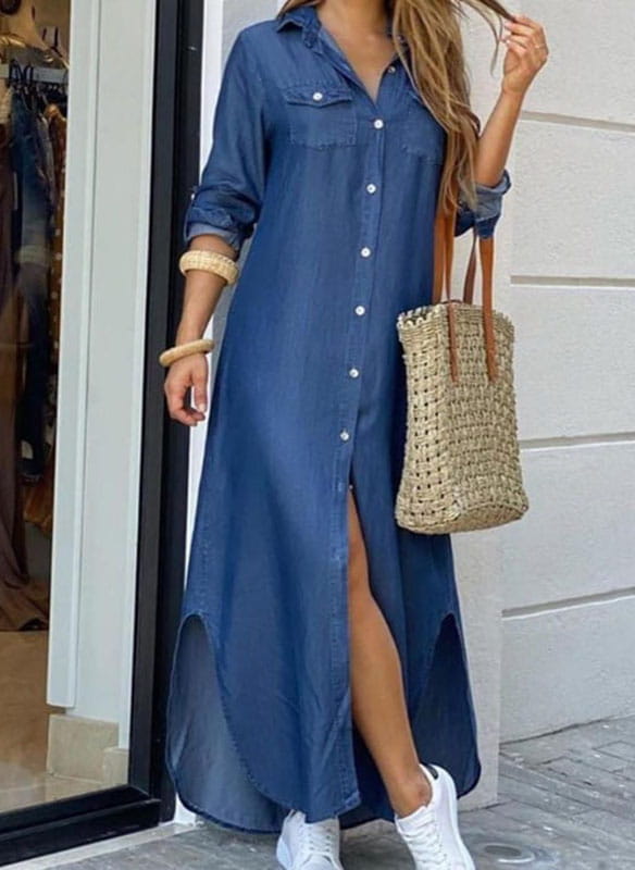Daje lekki i swobodny styl w upalne dni, sukienka Torella z rozcięciem i guzikami. Ten lekki i wygodny model utrzyma Cie ciepło bez zbędnego przegrzania. Z kieszeniami po bokach i rozpinanym dekoltem dodaje charakteru. Idealna na leniwe popołudnia z książką w parku czy przy winie z przyjaciółmi. Sukienka dżinsowa z rozcięciem zapewni wygodę bez rezygnacji ze stylu.