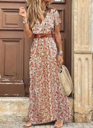 • Sukienka krótki rękaw dekolt okrągły do ziemi maxi długa falbany wzór lato na plażę boho Marrit