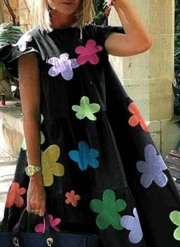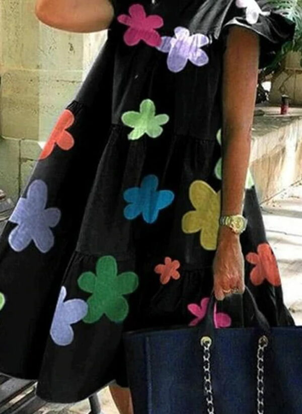 Sukienka midi za kolano dekolt prosty babydoll rękawki wzór kwiaty luźna romantyczna falbany lato Bolette