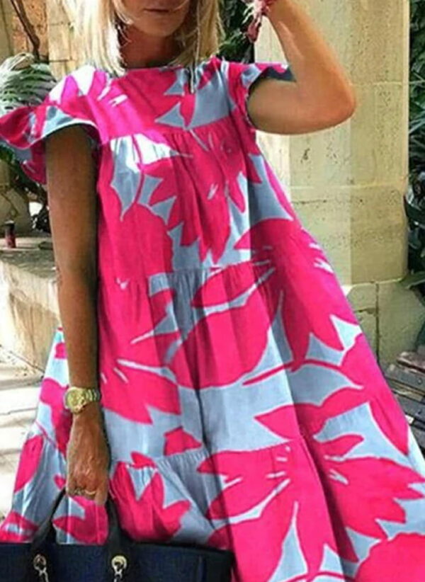 Sukienka midi za kolano dekolt prosty babydoll rękawki wzór kwiaty luźna romantyczna falbany lato Bolette