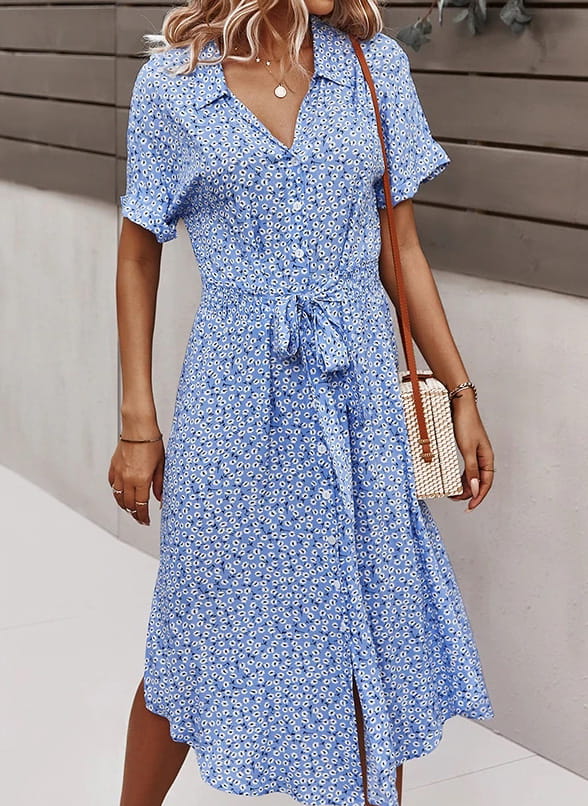 • Sukienka mini przed kolano krótka jednolita dekolt v guziki rozpinana kieszenie krótki rękaw jeans tunika Vally