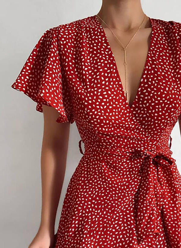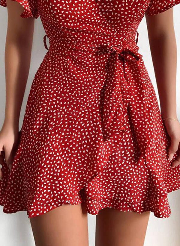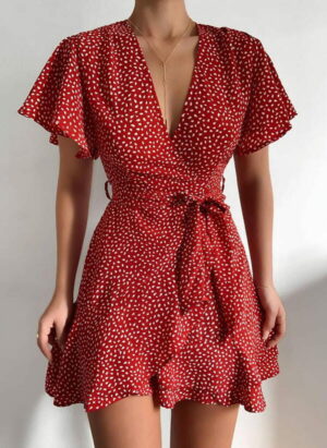 Sukienka mini przed kolano krótki rękaw dekolt v zakładka groszki grochy wiązanie falbany boho casual Marquitta