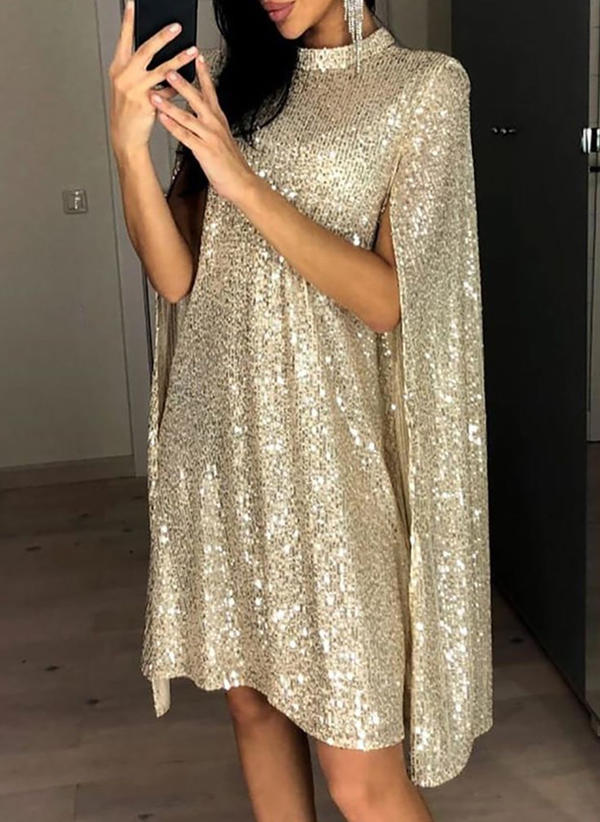 Sukienka rękawy wycięte mini przed kolano prosty dekolt luźna brokat błyszcząca cekiny sylwester peleryna wieczorowa Tzezka