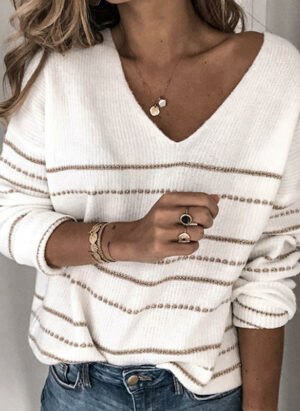 Sweter długi rękaw dekolt v paski prążki luźny casual Zeena