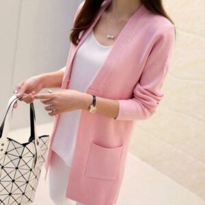 • Sweter kardigan długi rękaw rozpinany dzianina jodełka ciepły kieszenie casual boho jesień zima do pracy Liis