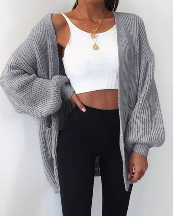 • Sweter kardigan długi rękaw rozpinany dzianina bufki dłuższy ciepły casual na co dzień do pracy Detta
